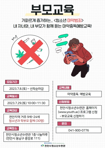 [Ytv영상스토리] 천안시청소년수련관은 오는 29일 오전 10시 천안지역 청소년 가족을 대상으로 ‘마약중독 예방교육’을 연다.