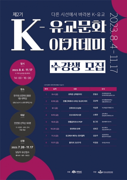 ‘K-유교 아카데미’ 참여는 7월 26일부터 11월 17일까지 선착순 50명까지 전화와 이메일로 신청할 수 있으며 수강료와 교재는 무료이다.