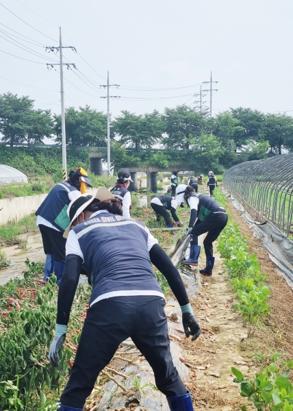 참여자들은 무더운 날씨 속 수해 농작물 제거 작업 등을 하며 구슬땀을 흘렸다.