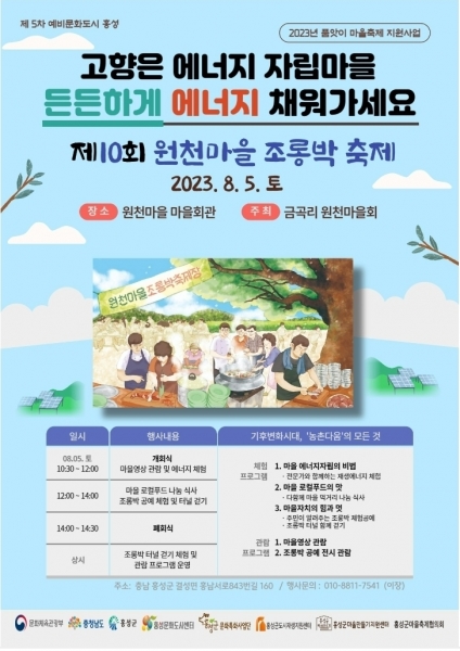 홍성군 결성면 원천마을 일원에서 펼쳐지는 제10회 원천마을 조롱박 축제는 ‘기후변화시대, 농촌다움의 모든 것’이라는 슬로건 아래 전문가와 함께하는 재생에너지 체험, 조롱박 공예 체험, 마을 로컬푸드 나눔 행사 등 다양한 체험 행사로 진행된다.