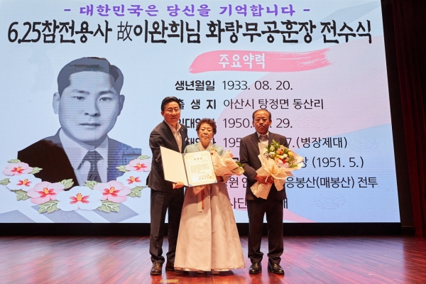 [Ytv영상스토리] 아산시는 지난 2일 시청 시민홀에서 열린 월례모임에서 6·25 참전 유공자 고 이완희 병장의 배우자 서용화, 아들 이용득 씨에게 화랑무공훈장과 증서·기념패를 전달했다.