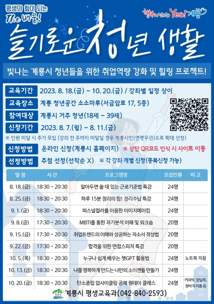 각 강좌는 개별 신청 가능하고 19세 이상부터 39세까지의 계룡시 거주 청년이라면 누구나 신청할 수 있으며 교육 신청은 계룡시 홈페이지를 통해 온라인 접수 가능하다.