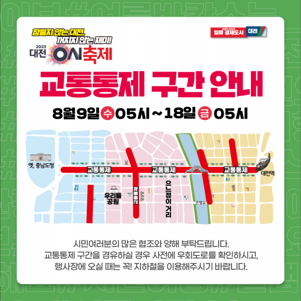 대전 0시 축제는 오는 8월 11일부터 17일까지 7일간 진행되지만, 행사 시설물 설치와 안전한 행사장 조성을 위해 9일부터 행사구간은 차 없는 거리로 운영된다.