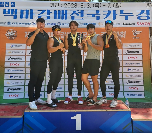 서산시청 카누팀 백마강배 준우승 기념촬영 모습(왼쪽부터 박민호 감독, 나재영, 강신홍, 최지성, 신동진)©서산시