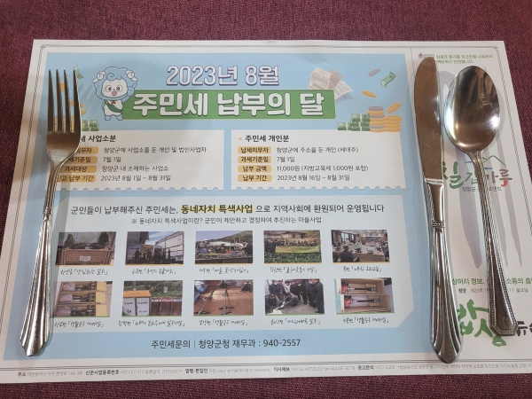 8월 정기분 주민세 납부 안내와 동네 자치 특색사업을 담은 종이 식탁보로 톡톡한 홍보 효과를 거두고 있다(사진=청양군)