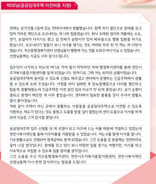 그간 도움을 주신 직산읍 등에 다시 한번 감사한다” 천안시 직산읍에 통합사례관리지원을 받고 새 희망을 찾은 A 씨가 보낸 감사의 편지가 도착했다.