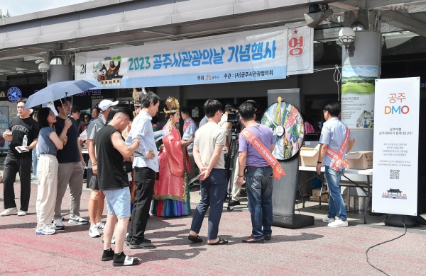 이들은 오는 9월 23일 개막하는 2023 대백제전의 성공적인 개최를 위해 축제 홍보물과 공주시 관광 정보가 담긴 안내문을 배포하고 공주10경을 담은 룰렛 게임을 진행해 흥미를 끌었다.