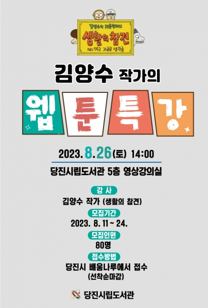 특강은 8월 26일 오후 2시부터 1시간 30분 동안 시립중앙도서관 5층 영상강의실에서 80명을 대상으로 무료로 진행될 예정이며 참여를 원하는 학생 및 시민 등 당진시 배움나루에서 신청할 수 있다.