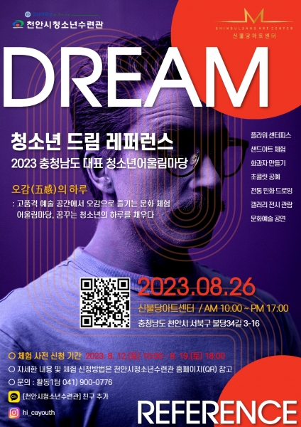 [Ytv영상스토리] 천안시 청소년수련관은 신불당아트센터와 함께 오는 26일 2023 충청남도 대표 청소년어울림마당 5회기 ‘청소년 드림 레퍼런스: 오감의 하루’를 운영한다고 밝혔다.