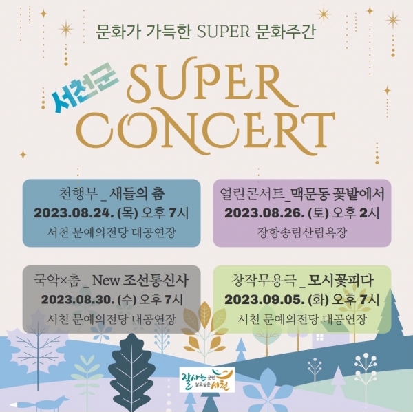 문화주간 내 주요 행사로는 24일 오후 7시 서천 문예의 전당에서 전통예술단 혼의 ‘천행무’ 26일 오후 4시 송림산림욕장에서 맥문동 축제와 연계한 서천필하모닉오케스트라 등의 음악회 ‘맥문동 꽃밭에서’ 30일 오후 7시 서천 문예의 전당에서 안산시립국악단 우수공연 프로그램인 ‘김봉곤 훈장과 함께하는 NEW 조선통신사’ 9월 5일 오후 7시 서천 문예의 전당에서 몽골국립예술단과 함께한 전통예술단 혼의 ‘모시 꽃 피다’ 등이 공연될 예정이다.