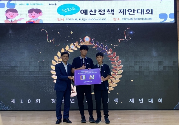 천안시가 지난 11일 개최한 ‘제10회 청소년 예산정책 제안대회’에서 대상을 받은 청지기 팀(김규태 오성중 1, 김예건 동성중 1).(사진=천안시)