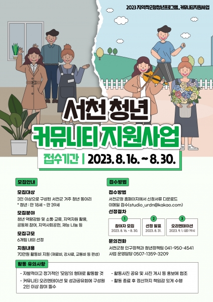 모집대상은 서천에서 활동하는 18세이상 39세 이하 3인 이상의 청년으로 구성된 동아리로 서천군에 주소를 두고 있거나, 서천군 소재 직장에 다니고 있는 청년이면 가능하다.