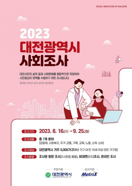 조사 대상은 대전시에 거주하는 가구 중 표본 추출로 선정된 5천 가구의 가구주 및 만 15세 이상 가구원 12,000여명이 대상이 된다.