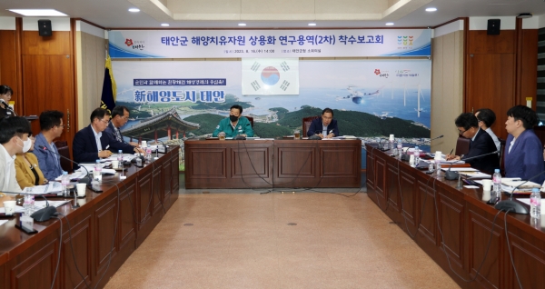 16일 군청 소회의실에서 진행된 ‘해양치유자원 상용화 연구용역(2차) 착수보고회’ 모습.(사진=태안군)