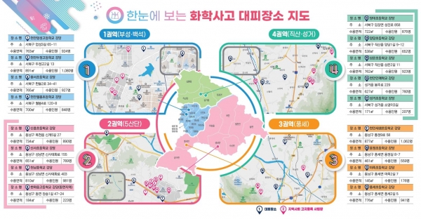 시 관계자는 “천안시 화학사고 대피장소 안내지도 배포를 통해 화학 사고 발생 시 신속하게 주민들이 대피하고 대응할 수 있도록 만전을 기하겠다”며 “화학물질로부터 안전한 천안을 만들기 위해 적극 노력하겠다”고 말했다.