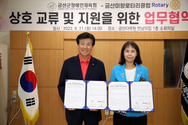금산군장애인체육회장을 맡고 있는 박범인 금산군수는 “대한민국이 선진국 반열에 올랐지만 아직도 사회적 약자에 대한 배려와 지원이 아쉽다고 생각한다”며 “이번 미향로타리클럽과의 업무협약 체결을 계기로 금산군 장애인 체육인들이 더욱 적극적으로 활동할 수 있을 것”이라고 말했다.