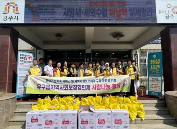 이번 나눔에는 미래비전, 한흥농장, 농업회사법인 푸른친환경, 장터국수, 대원푸드, 드림즈협동조합 카페, 유구전통시장 시장닭집, 백송식당, 중앙회관, GS편의점 등 관내 업체와 주민들이 참여했다.