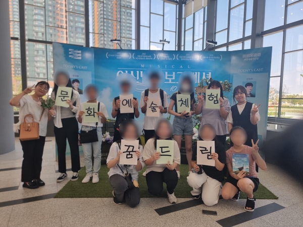 세종시 꿈드림 문화예술체험 프로그램은 학교 밖 청소년들이 또래들과 함께 다양한 문화 및 예술을 경험하고 이를 통해 건강한 스트레스 해소법을 배울 수 있도록 영화, 뮤지컬 등 다양한 문화예술을 체험 하는 프로그램으로 이번 2023년 문화예술체험 프로그램은 청소년 욕구조사에 따라 세종예술의전당에서 뮤지컬“여신님이 보고계셔”를 관람했다.