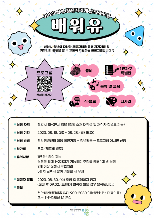 [Ytv영상스토리] 천안시는 천안청년센터이음이 청년들의 다양한 취미생활 등을 포함한 자기계발 프로그램인 ‘배워유’ 2차 참여자를 모집한다고 밝혔다.