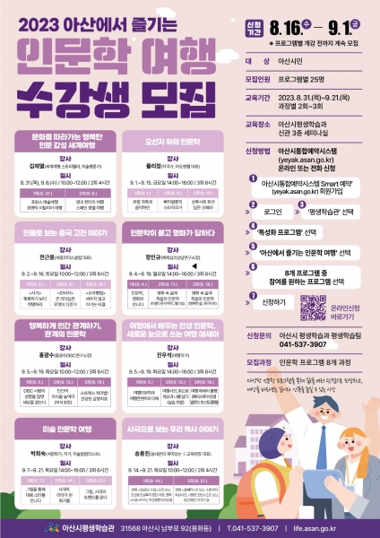 이번 ‘2023 아산에서 즐기는 인문학 여행’은 오는 31일부터 9월 21일까지 프로그램별 2~3회씩 운영된다.