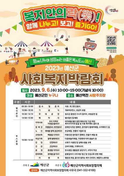 [Ytv영상스토리] 예산군은 사회복지사업에 대한 군민 이해증진과 관련 기관·단체의 정보교류 및 협력 강화를 위해 예산군이 주최하고 예산군지역사회보장협의체가 주관하는 ‘2023년 예산군 사회복지박람회’를 오는 9월 6일 예산역전시장주차장에서 개최한다.