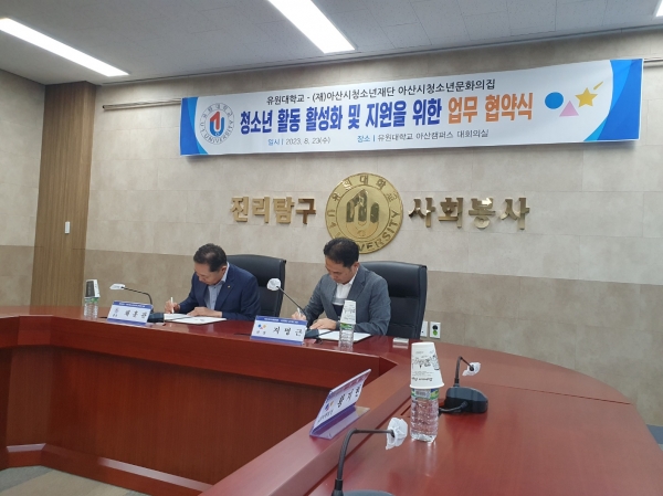 청소년들의 건강한 성장을 위한 활동 지원 및 활성화를 위한 유원대학교 아산캠퍼스(총장 채훈관)와 업무 협약을 체결했다(사진=아산시청소년문화의집)