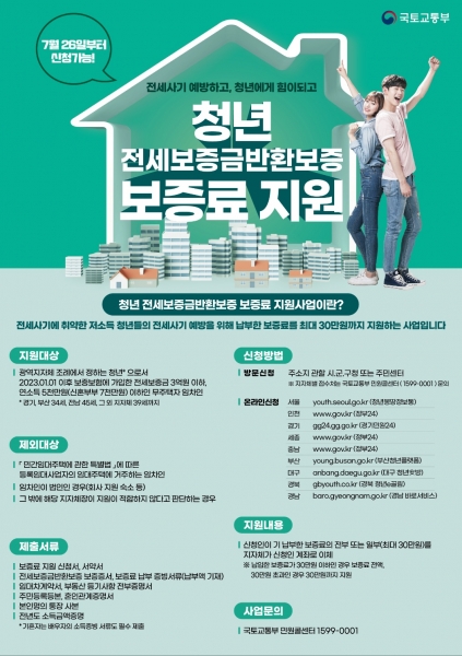 지원 대상은 19세~39세 청년으로 관내에 주소를 두고 23년 1월 1일 이후 전세보증금반환보증에 가입한, 임차보증금 3억원 이하 연 소득 5,000만원 이하의 무주택 청년이다.