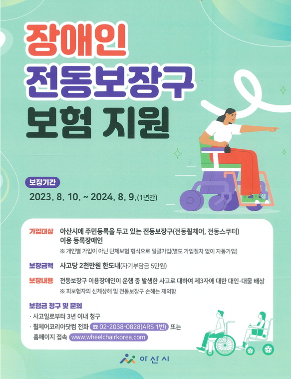 보장 기간은 2023년 8월 10일부터 2024년 8월 9일까지이며 아산시에 주민등록을 둔 전동보장구 이용 등록장애인이면 별도 가입 절차 없이 자동으로 가입된다.