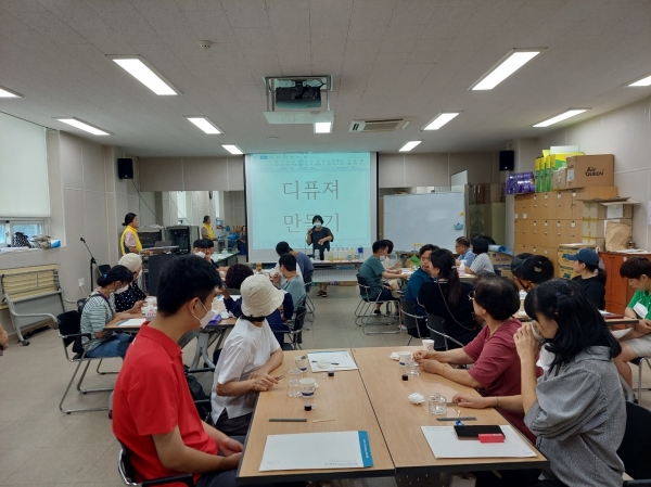 인식개선교육 이후 실시된 디퓨저 만들기 활동은 전문강사의 지도로 장애인과 비장애인이 서로 협력해 작품을 완성하며 서로를 이해하는 시간을 보냈다.