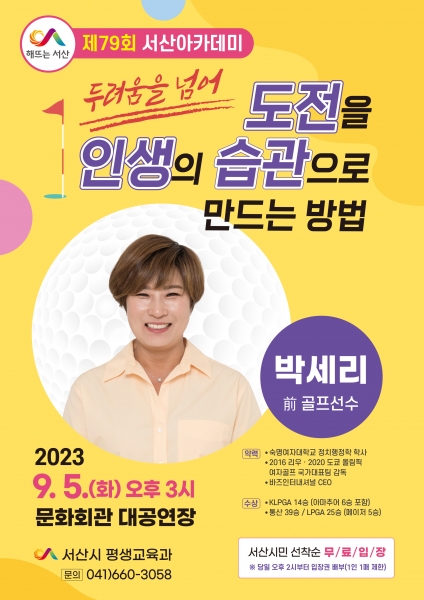 [Ytv영상스토리] 충남 서산시가 9월 5일 오후 3시 문화회관 대공연장에서 박세리 전 골프선수를 초청해‘제79회 서산아카데미’를 개최한다고 밝혔다.