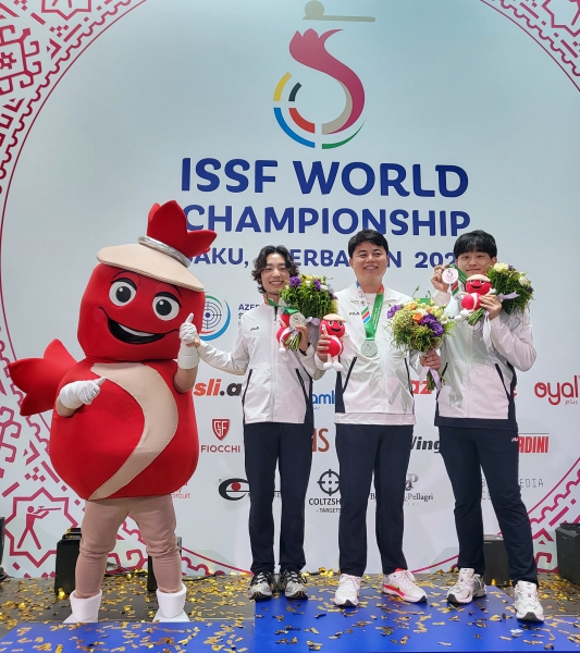 2023 ISSF 바쿠 세계사격선수권대회에서 획득한 메달을 들고 기념사진을 찍는 대한민국 선수단(오른쪽 최보람 선수)(사진=서산시)