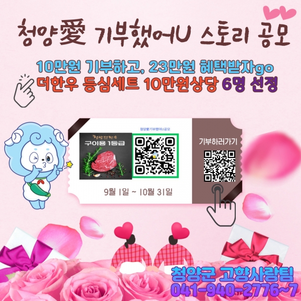 기간 내 청양군에 고향사랑 기부금 10만원을 기부하고 그 사연을 네이버폼을 통해 응모하면 6명을 선정해 ‘청양 더 한우’ 등심 세트를 증정하는 이벤트다.