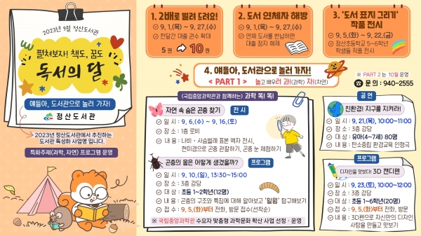 정산도서관은 ‘펼쳐보자 책도, 꿈도’라는 슬로건 아래 9월 1일부터 27일까지 얘들아, 도서관으로 놀고 배우러 과 자 행사 도서 표지 그리기 작품 전시 대출 권수 2배 확대 도서 연체자 대출 정지 해제 등을 추진한다.
