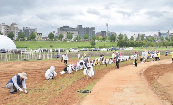 이날 자원봉사자들은 이른 아침부터 코스모스와 해바라기 등 12만 본에 달하는 꽃묘를 심으며 구슬땀을 흘렸다.