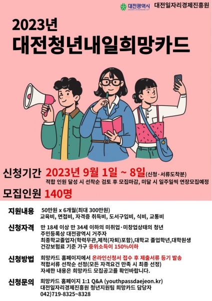 보다 자세한 사항은 대전시청 또는 청년내일희망카드 홈페이지에 게시된 공고문을 통해 확인할 수 있으며 궁금한 사항은 대전일자리경제진흥원 청년지원팀으로 문의하면 된다.