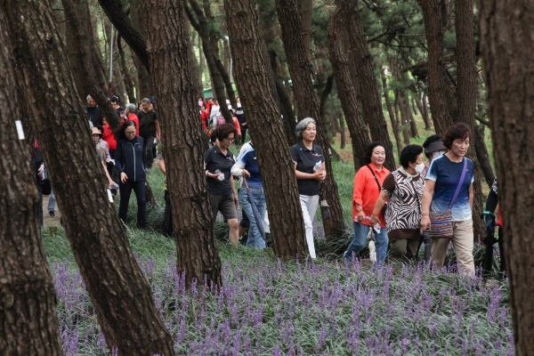 이날 참여자들은 장항 송림산림욕장 제4주차장에서 출발해 송림숲 산책로를 따라 맥문동 꽃 축제 폐막식이 진행되는 주 무대를 거쳐 다시 행사장으로 복귀하는 4㎞ 구간을 걸었다.