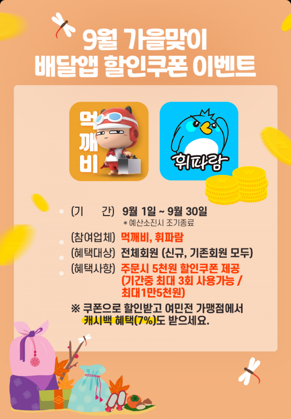 세종시 민관협력 배달앱인 ‘먹깨비’와 ‘휘파람’ 회원이면 누구나 주문 시 5,000원씩 총 3회에 걸쳐 최대 1만 5,000원의 혜택을 받을 수 있다.