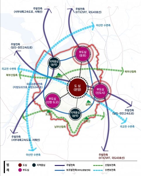 시는 2040년 도시미래상을 ‘자연과 문화, 경제가 공존하는 상생·온휴도시 아산’으로 명시하고 ‘웰빙문화도시, 스마트경제도시, 위드상생도시’ 등 3대 목표와 ‘체류 관광 활성화, 지속 가능한 성장 동력 창출, 충남혁신거점 산업경쟁력 강화, 생활권별 특성과 주민 서비스 수요를 반영한 맞춤형 도시환경 조성’ 등을 세부 실천 전략으로 수립했다.