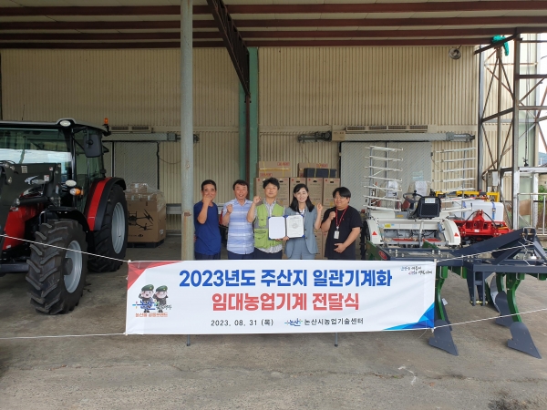 [Ytv영상스토리] 논산시 농업기술센터가 논 작물에 비해 기계화율이 낮은 밭작물 농사를 뒷받침하기 위해 양촌면 소재 양촌윤가농원 윤권중 대표에게 장기 임대용 농업기계를 전달했다.