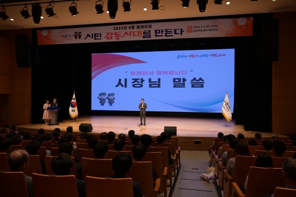 1일 오전 논산아트센터 대공연장에서 400여 시민이 모인 가운데 9월 월례모임을 개최했다(사진=논산시)