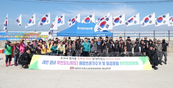 특수임무유공자회 회원 및 유가족, 가세로 군수, 봉사자 등 100여명은 토요일인 지난 2일 남면 마검포항과 나치도를 찾아 해양쓰레기를 수거하며 지역사랑의 마음을 전했다.(사진=태안군)