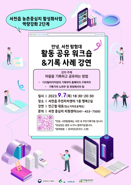 교육은 안근철 대표를 초빙해 ‘마을을 기록하고 공유하는 방법’이라는 주제로 진행되며 기록사례워크숍은 서천 군민 누구나 신청할 수 있다.