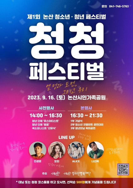 백성현 논산시장은 “강경젓갈축제에 상월고구마를 조화시켜 새로운 축제가 만들어진 것처럼, 청년의 날 행사에 청소년 문화제가 더해져 커다란 시너지 효과가 만들어질 것으로 기대한다”며 “청청페스티벌을 지역의 미래인 젊은 세대들이 함께 즐기고 호흡할 수 있는 화합의 장으로 만들겠다”고 말했다.