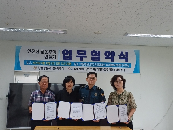 이번 업무협약식은 석문LH천년나무아파트에 거주하는 입주민들의 안전을 위한 교통사고 및 보이스피싱 등 범죄예방을 위해 개최됐다.