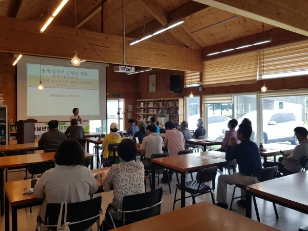 이번 대화마당은 충남대학교 충청문화연구소 문희순 교수를 강사로 초빙해 ‘홍성시인 김호연재 가족문학사 이야기’를 주제로 홍성군의 역사와 문화 이해를 통한 홍성군 마을만들기 협의회 정체성 형성과 마을만들기 사업 활성화를 목적으로 진행됐다.