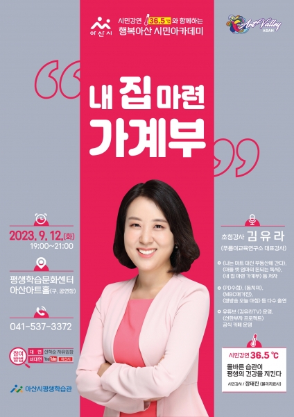 [Ytv영상스토리] 아산시가 오는 12일 오후 7시 평생학습관 아산아트홀에서 김유라 작가를 초청해 ‘내 집 마련 가계부’라는 주제로 ‘행복아산 시민아카데미’를 개최한다.