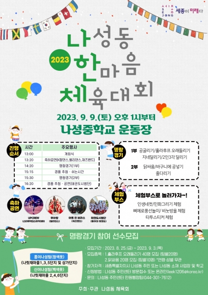 이날 행사는 오후 1시 개회식을 시작으로 청소년댄스팀, 밸리댄스, 재즈밴드 등 축하공연과 명랑운동회 등 나성동 주민들이 함께 즐길 수 있는 프로그램이 마련되어 있다.