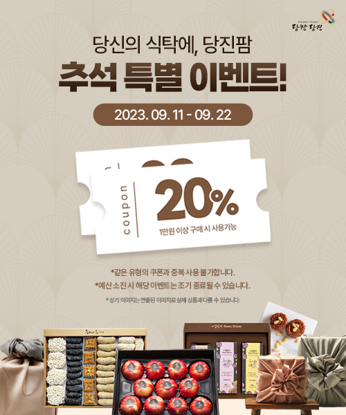 이번 특판 행사는 다가오는 추석에 우수한 당진시 농특산물 소비판로를 확대하기 위해 실시되며 당진팜에서 판매되는 모든 농특산물에 대해 사용할 수 있는 20% 할인 쿠폰을 제공한다.