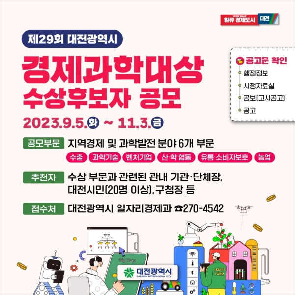 김영빈 대전시 경제과학국장은 “대전의 경제와 과학 발전에 헌신한 분들이 경제과학대상에 선정될 수 있도록 많은 관심과 참여 당부드린다”고 말했다.