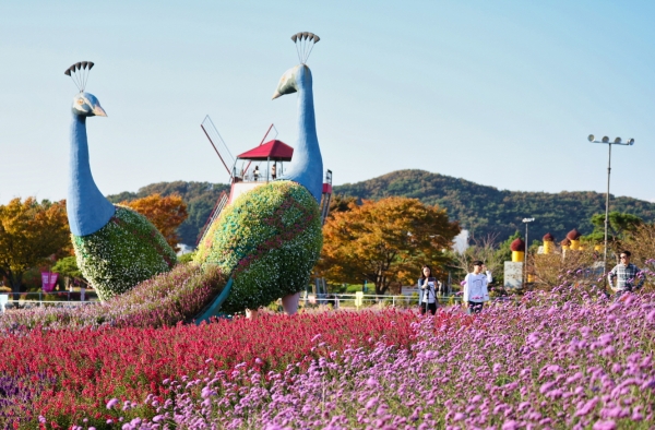 코리아플라워파크의 랜드마크이기도 한 공작 조형물은 몸통을 제외한 꼬리 부분이 꽃으로 장식돼 있다.